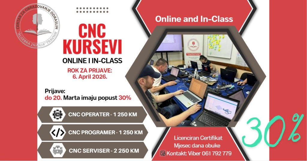 🎯 U Centru za obrazovanje ALGEBRA ZNANJA imaš priliku da stekneš praktična znanja i vještine za rad na savremenim CNC mašinama, u zanimanjima koja su veoma tražena u Bosni i Hercegovini i širom Evrope.